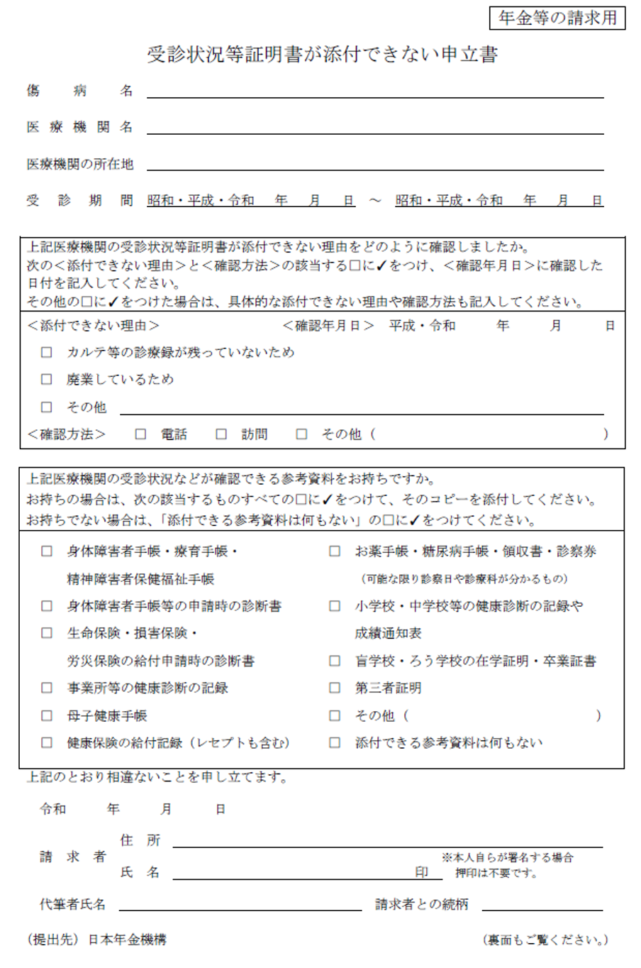 ただし、医師法によってカルテの保存期間は5年となっていますので、初診時の医療機関が5年以上前だったり、初診の医療機関が廃院していた場合は、受診状況等証明書が取れない場合もあります。その場合は「受診状況等証明書が添付できない理由書」付けて提出します。