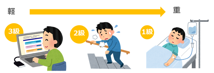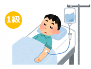 日常生活に著しい支障があり、かつ他人の介助が必須。ただし、例外として、全盲の方などは働いていてもこの等級になることがあります。